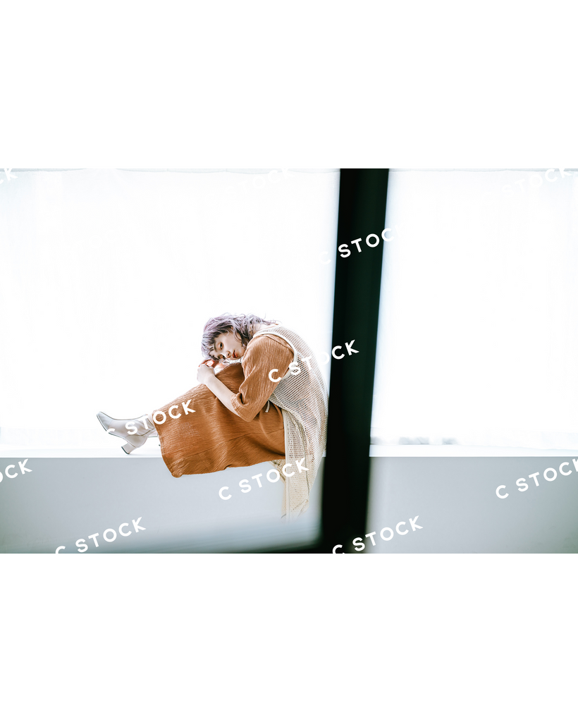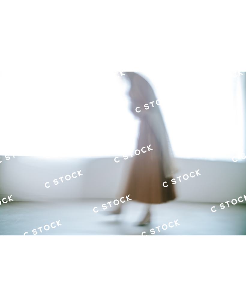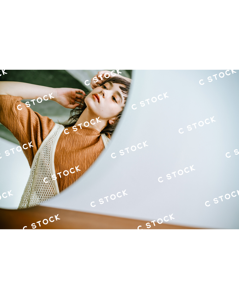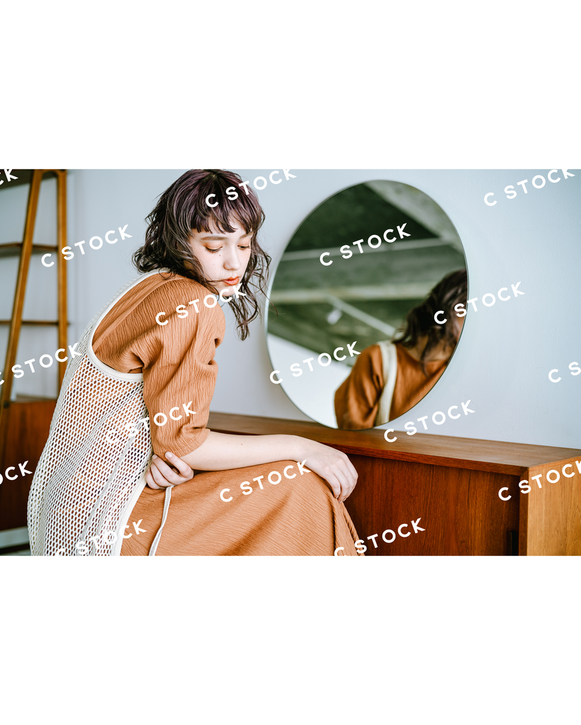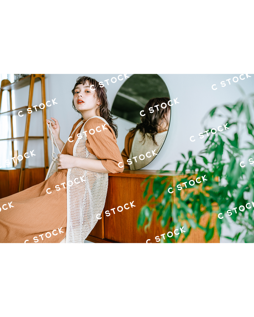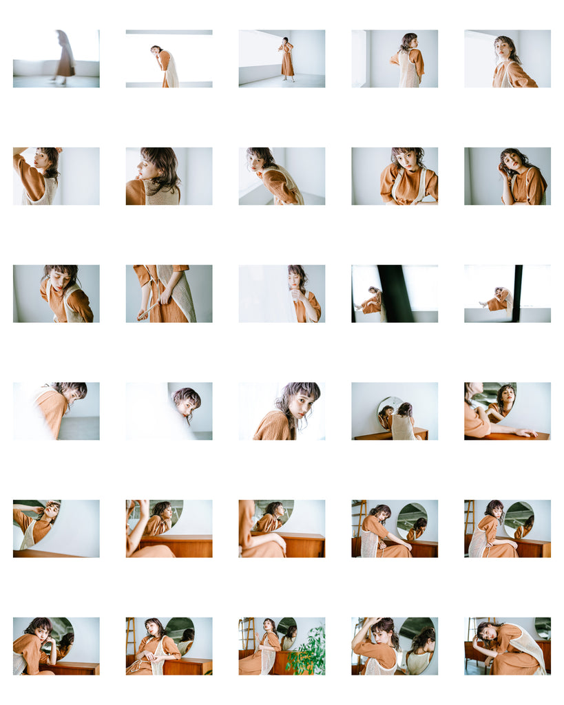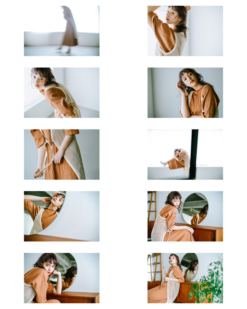 緑が生い茂り、外が暑くなってきた頃の家を"夏の影"と捉え、その夏影で上品に暮らす人をイメージしてスタイリングしました。茶色を基調としたワンピースをメインに、さまざまな綺麗なポージングで上品な人間性を表現しました。メインの写真では、同系色であるアンティークの家具を使い、+緑を差し込むことで、写真のトーンを整えるとともにメインビジュアルとしての存在感を創り出しています。白飛びでぼやけている窓は暑い真夏の日差しを、モルタルやコンクリートの影はどこか涼しさをイメージさせます。