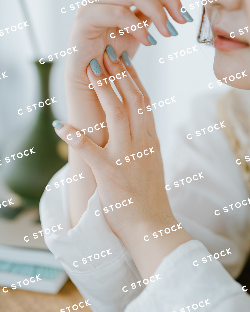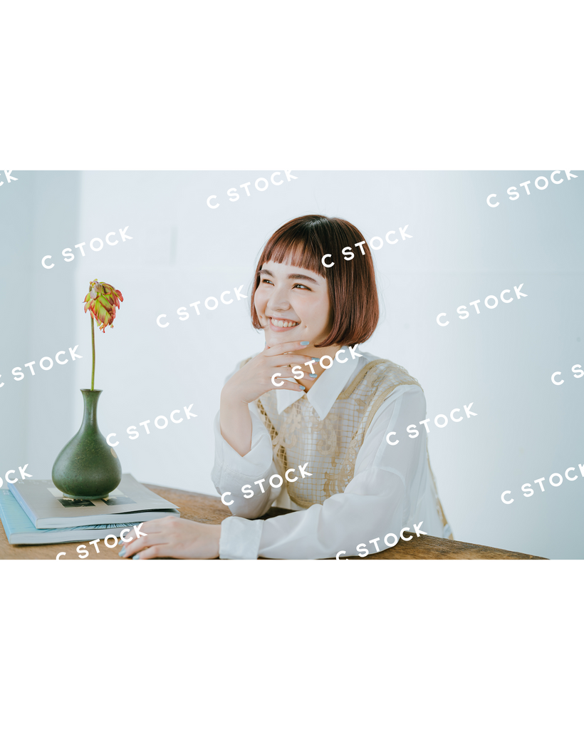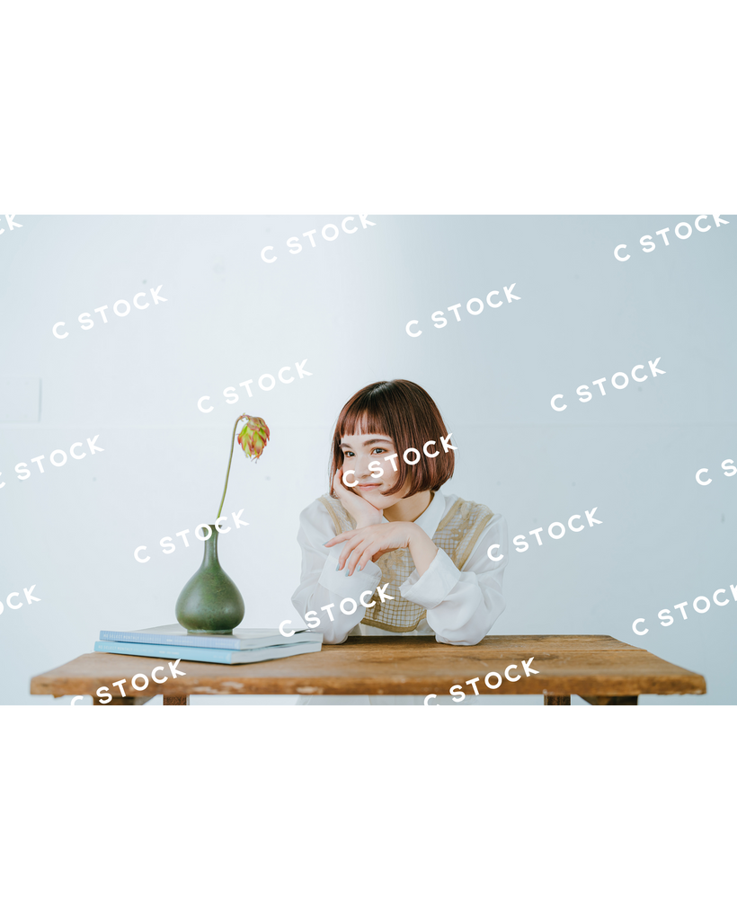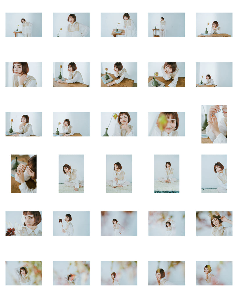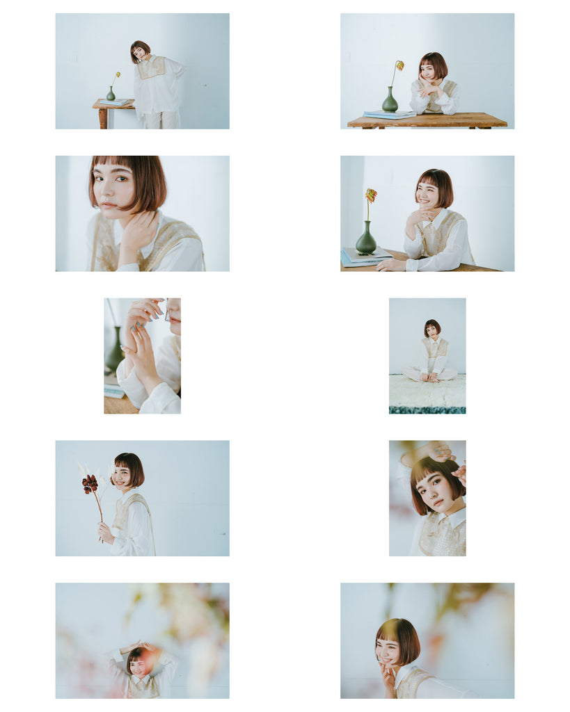 秒針よりも素早く動いている物が無いほど、スロウで緩やかな時間をくつろいでいる女性をイメージしてスタイリングしました。ヘアスタイルやメイクは家で過ごしている落ち着きのある印象に、衣装に関しても、洋服と部屋着を組み合わせ、素足にすることで、"くつろぎ"を表現しました。花器や家具などでワンポイントごとに差し色を含ませることで、写真に世界観をプラスし、複数枚使った時の統一感を持たせました。